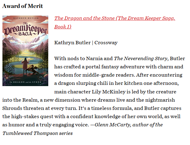 In Dream Keeper Saga news, the third book, Lost in the Caverns, releases in May! I’m slogging through the penultimate round of revisions on book four. I’m also delighted and grateful to announce that the first book, The Dragon and the Stone, received an award in Christianity Today’s 2023 book awards!