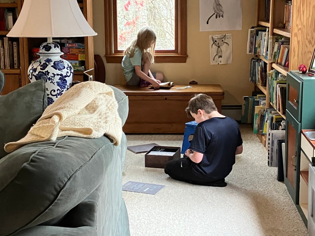 On quieter days after breakfast we dive right into a full school day, but today at 10 am they have an online history class with staff at the Strawbery Banke Museum. They learn about how historians study the past using artifacts and primary sources.